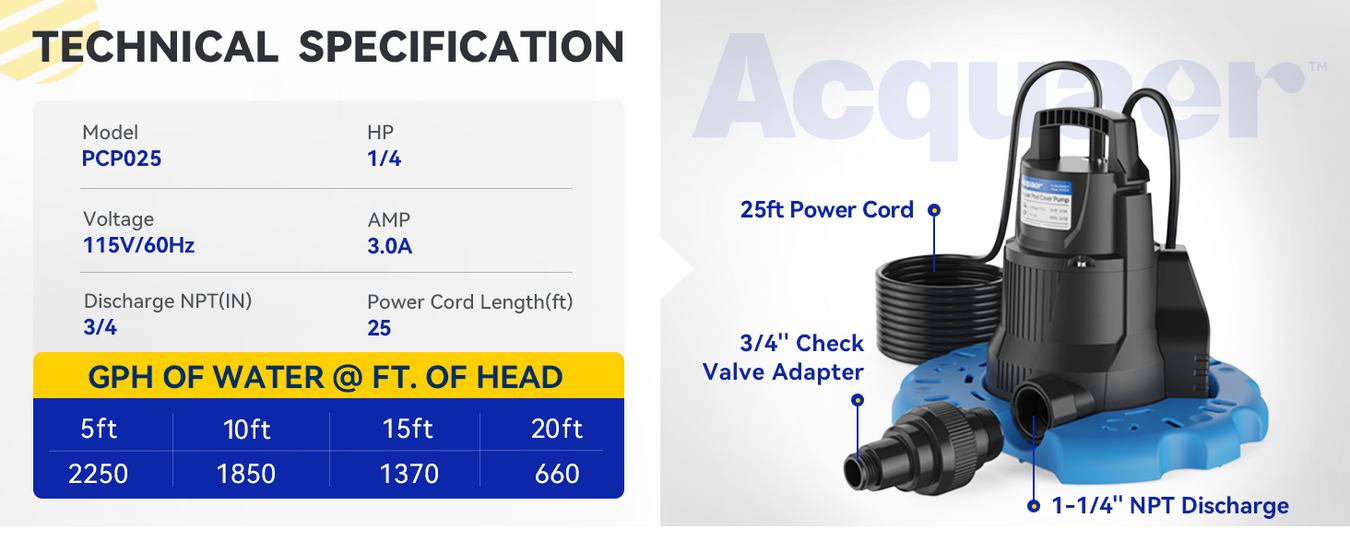 PCP025 1/4 HP 115V Swimming Pool Cover Pump, 2250 GPH