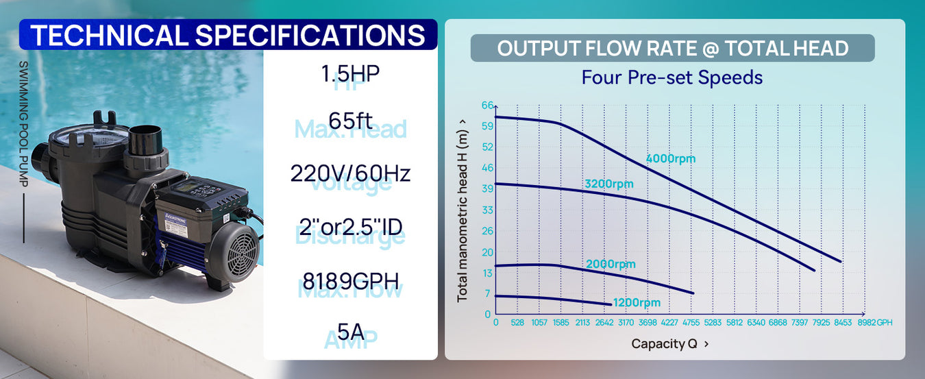 This pool pump features four programmable speed settings, ranging from 1200 RPM (3302 GPH) to 4000 RPM (11359 GPH). Each speed can be individually scheduled, allowing you to tailor the pool circulation to your daily routine.